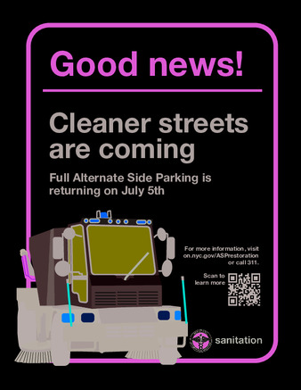 Flyers to inform New Yorkers that full alternate side parking is returning after pandemic service cuts.