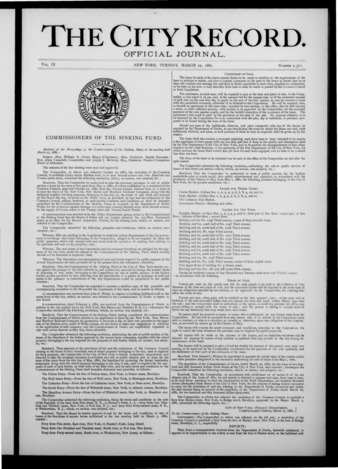 The City Record newspaper publishes notices which includes but is not limited to: public hearings and meetings, public auctions and sales, solicitations and awards and official rules proposed and adopted by city agencies. This is the City Record Newspaper for March 22, 1881.