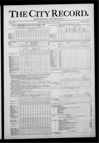 The City Record newspaper publishes notices which includes but is not limited to: public hearings and meetings, public auctions and sales, solicitations and awards and official rules proposed and adopted by city agencies. This is the City Record Newspaper for July 23, 1897.