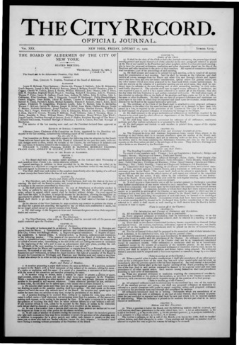 The City Record newspaper publishes notices which includes but is not limited to: public hearings and meetings, public auctions and sales, solicitations and awards and official rules proposed and adopted by city agencies. This is the City Record Newspaper for January 17, 1902.