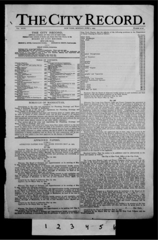 The City Record newspaper publishes notices which includes but is not limited to: public hearings and meetings, public auctions and sales, solicitations and awards and official rules proposed and adopted by city agencies. This is the City Record Newspaper for June 01, 1903.
