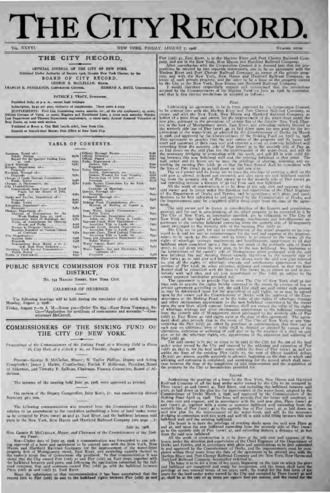 The City Record newspaper publishes notices which includes but is not limited to: public hearings and meetings, public auctions and sales, solicitations and awards and official rules proposed and adopted by city agencies. This is the City Record Newspaper for August 07, 1908.