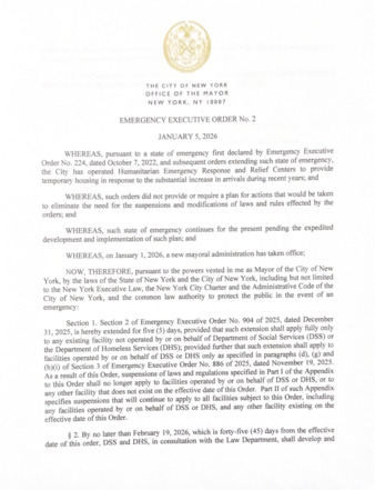 Emergency Executive Order No. 2, dated January 5, 2026; is being submitted as it relates to the state of emergency the city has operated Humanitarian Emergency Response and Relief Centers to provide temporary housing in response to the substantial increase in arrivals during recent years.