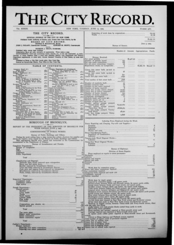 The City Record newspaper publishes notices which includes but is not limited to: public hearings and meetings, public auctions and sales, solicitations and awards and official rules proposed and adopted by city agencies. This is the City Record Newspaper for June 13, 1905.