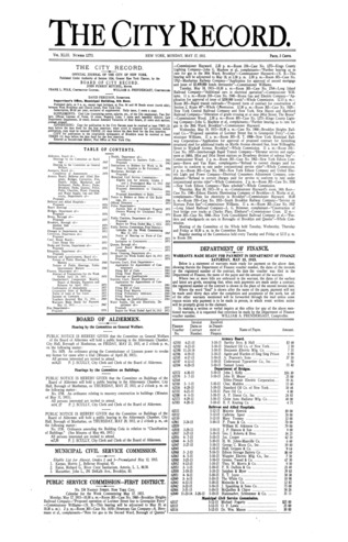 The City Record newspaper publishes notices which includes but is not limited to: public hearings and meetings, public auctions and sales, solicitations and awards and official rules proposed and adopted by city agencies. This is the City Record Newspaper for May 17, 1915.