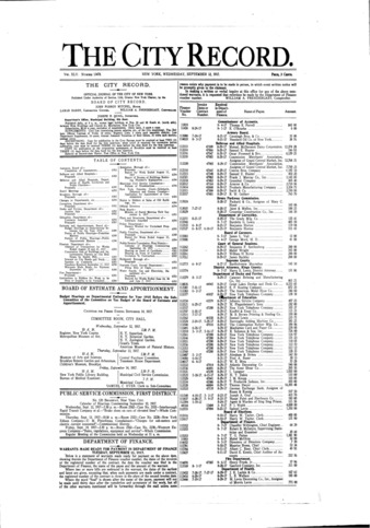 The City Record newspaper publishes notices which includes but is not limited to: public hearings and meetings, public auctions and sales, solicitations and awards and official rules proposed and adopted by city agencies. This is the City Record Newspaper for September 12, 1917.