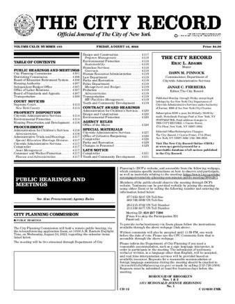 The City Record newspaper publishes notices which includes but is not limited to public hearings and meetings, public auctions and sales, solicitations and awards and official rules proposed and adopted by city agencies.