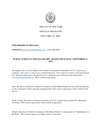 PUBLIC SCHEDULE FOR MAYOR ERIC ADAMS FOR SUNDAY, SEPTEMBER 11, 2022