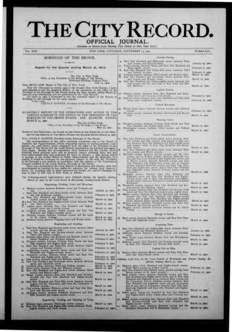 The City Record newspaper publishes notices which includes but is not limited to: public hearings and meetings, public auctions and sales, solicitations and awards and official rules proposed and adopted by city agencies. This is the City Record Newspaper for September 13, 1902.