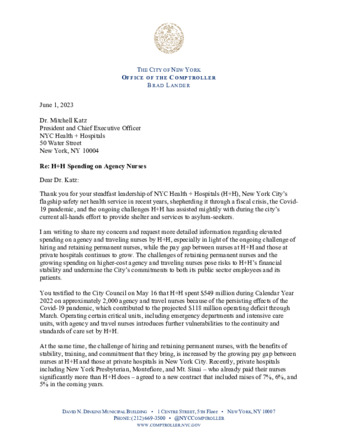 - Letter to Dr. Mitchell Katz regarding H+H spending on agency and travel nurses