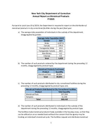 Pursuant to Local Law 10 of 2024, this report provides information regarding the provision of menstrual products in city jails.