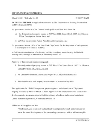 IN THE MATTER OF an application submitted by The Department of Housing Preservation and Development (HPD) 1) pursuant to Article 16 of the General Municipal Law of New York State for: a) the designation of property located at 313 West 112th Street (Block 1847, Lot 13) as an Urban Development Action