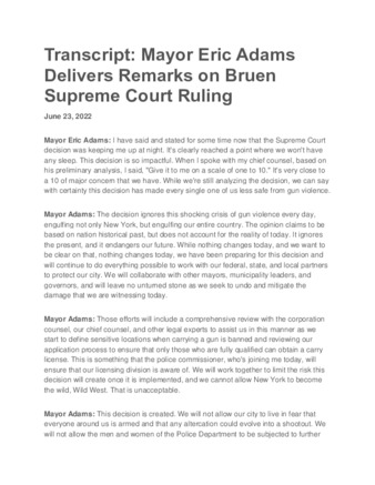 A transcript about New York City Mayor Eric Adams delivering remarks based on the Bruen Supreme Court Ruling regarding New York's handgun law.
