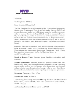 Summary report with information from data base listed in subdivision a of 6-116.2 and information for each franchise, concession or contract for goods or services having a value of more than ten thousand dollars or in the case of construction, having a value of more than fifteen thousand dollars. Includes the annual reporting on labor peace agreements.