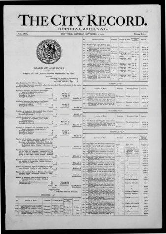 The City Record newspaper publishes notices which includes but is not limited to: public hearings and meetings, public auctions and sales, solicitations and awards and official rules proposed and adopted by city agencies. This is the City Record Newspaper for November 02, 1901.