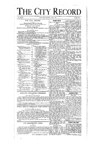 The City Record newspaper publishes notices which includes but is not limited to: public hearings and meetings, public auctions and sales, solicitations and awards and official rules proposed and adopted by city agencies. This is the City Record Newspaper for June 01, 1911.