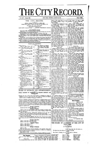 The City Record newspaper publishes notices which includes but is not limited to: public hearings and meetings, public auctions and sales, solicitations and awards and official rules proposed and adopted by city agencies. This is the City Record Newspaper for March 30, 1916.