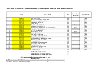 Pursuant to Admin Code Sect. 14-153(c), this quarterly report contains 1) the number of leaving the scene incidents with a critical injury, 2) the number of such incidents the department closed to arrest and closed without an arrest; and 3) the number of notices of violation issued for 19-191