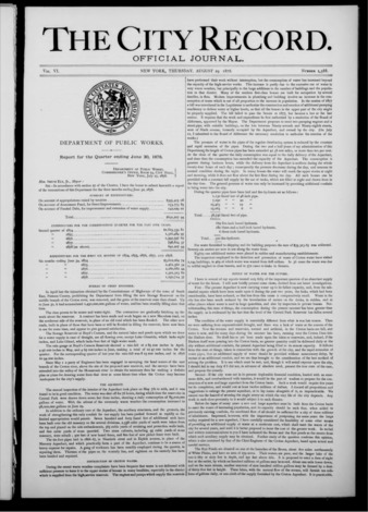 The City Record newspaper publishes notices which includes but is not limited to: public hearings and meetings, public auctions and sales, solicitations and awards and official rules proposed and adopted by city agencies. This is the City Record Newspaper for August 29, 1878.