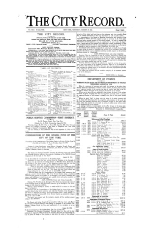 The City Record newspaper publishes notices which includes but is not limited to: public hearings and meetings, public auctions and sales, solicitations and awards and official rules proposed and adopted by city agencies. This is the City Record Newspaper for August 27, 1914.