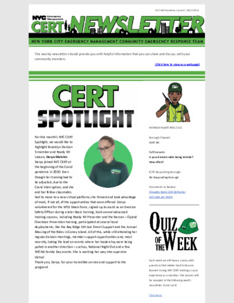 New York City Emergency Management is responsible for the NYC Community Emergency Response Team (CERT) program and distributes this weekly CERT newsletter to all active members so that they stay up-to-date on new opportunities, policies and initiatives that affect their membership.