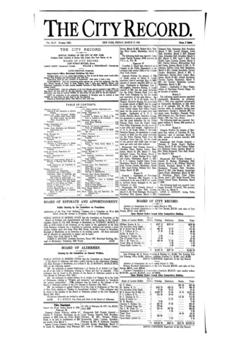 The City Record newspaper publishes notices which includes but is not limited to: public hearings and meetings, public auctions and sales, solicitations and awards and official rules proposed and adopted by city agencies. This is the City Record Newspaper for March 17, 1916.