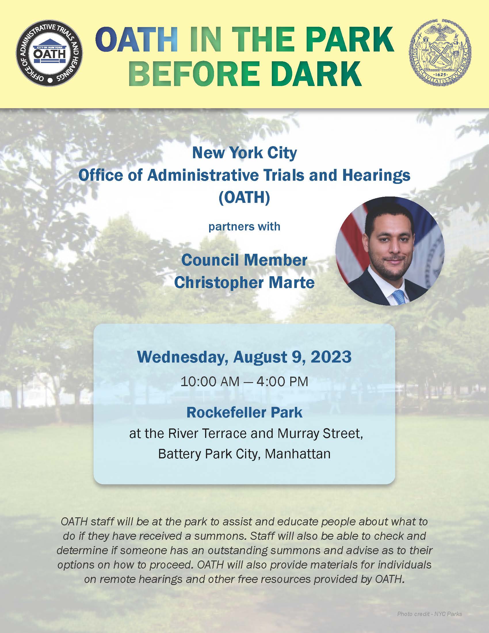 OATH staff were at the park to assist and educate individuals about what to do should they have received a summons and to check to determine if someone has an outstanding summons. Materials about remote hearings and other free resources were provided to the public as well.