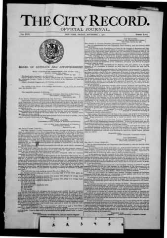 The City Record newspaper publishes notices which includes but is not limited to: public hearings and meetings, public auctions and sales, solicitations and awards and official rules proposed and adopted by city agencies. This is the City Record Newspaper for November 01, 1901.