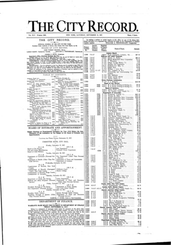 The City Record newspaper publishes notices which includes but is not limited to: public hearings and meetings, public auctions and sales, solicitations and awards and official rules proposed and adopted by city agencies. This is the City Record Newspaper for September 15, 1917.