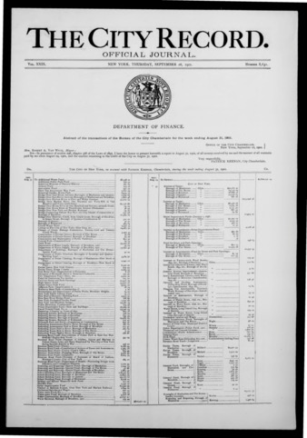 The City Record newspaper publishes notices which includes but is not limited to: public hearings and meetings, public auctions and sales, solicitations and awards and official rules proposed and adopted by city agencies. This is the City Record Newspaper for September 26, 1901.