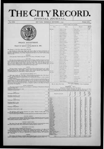 The City Record newspaper publishes notices which includes but is not limited to: public hearings and meetings, public auctions and sales, solicitations and awards and official rules proposed and adopted by city agencies. This is the City Record Newspaper for November 07, 1901.