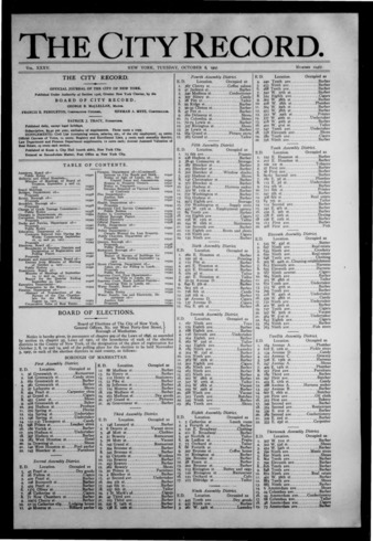 The City Record newspaper publishes notices which includes but is not limited to: public hearings and meetings, public auctions and sales, solicitations and awards and official rules proposed and adopted by city agencies. This is the City Record Newspaper for October 08, 1907.