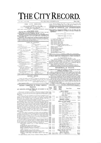 The City Record newspaper publishes notices which includes but is not limited to: public hearings and meetings, public auctions and sales, solicitations and awards and official rules proposed and adopted by city agencies. This is the City Record Newspaper for September 22, 1916.