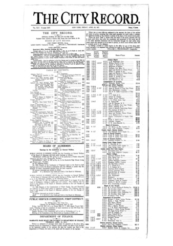 The City Record newspaper publishes notices which includes but is not limited to: public hearings and meetings, public auctions and sales, solicitations and awards and official rules proposed and adopted by city agencies. This is the City Record Newspaper for April 20, 1917.