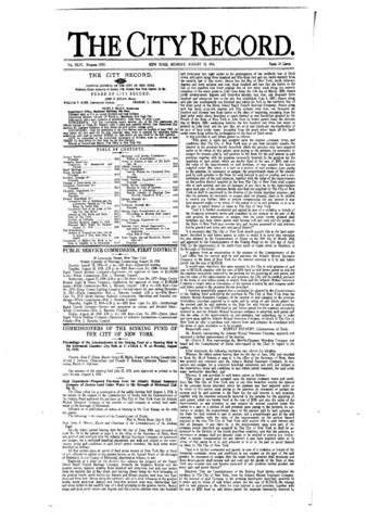 The City Record newspaper publishes notices which includes but is not limited to: public hearings and meetings, public auctions and sales, solicitations and awards and official rules proposed and adopted by city agencies. This is the City Record Newspaper for August 19, 1918.