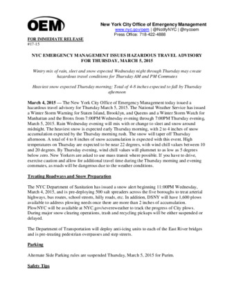 - 17-15 NYC Emergency Management Issues Hazardous Travel Advisory for Thursday, March 5, 2015