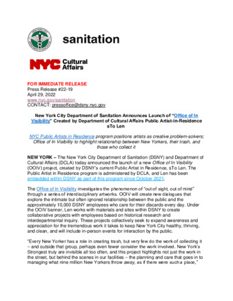 22-19__04.2922__NYC_Sanitation_announces_launch_of_Office_of_In_Visibility_Created_by_Dept_of_Cultural_Affairs_Public_Artist-in-Residence_sTo_Len.pdf | 2022-05-05 | Download |