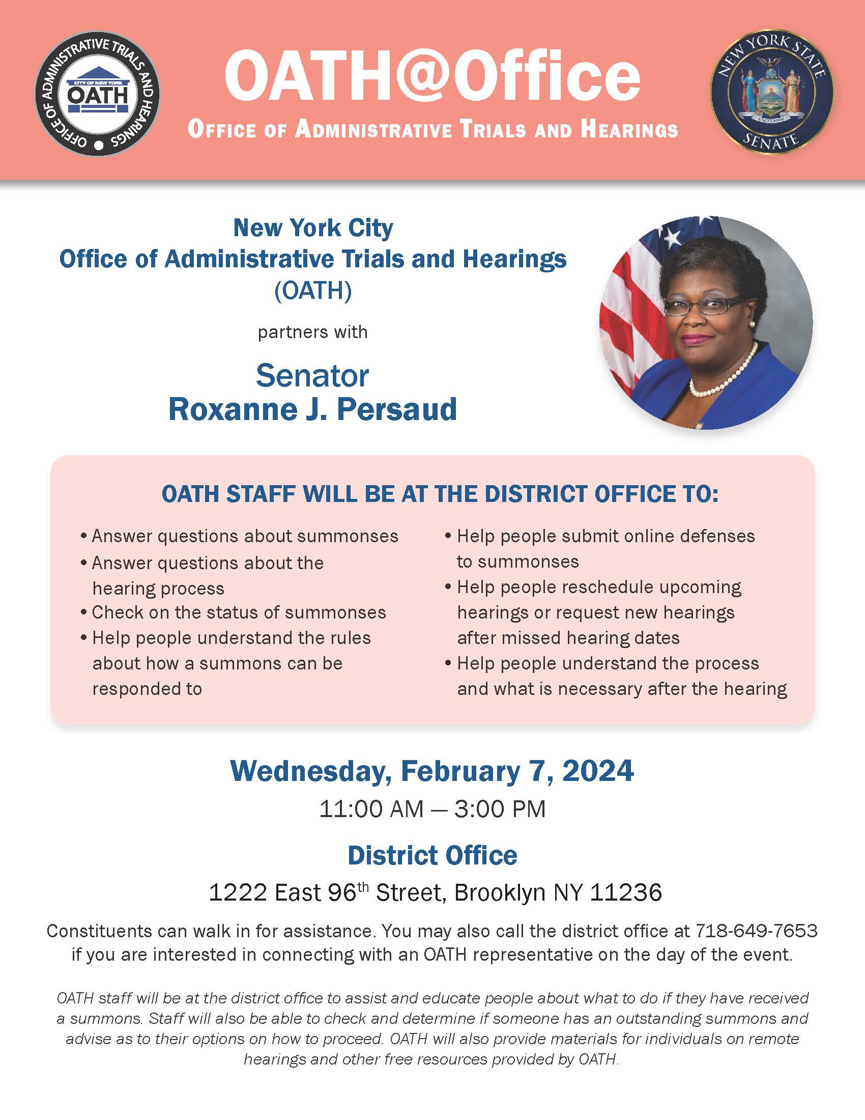 OATH staff were at the district office to assist and educate people about what to do should they have received a summons and to check to determine if someone has an outstanding summons. Materials about remote hearings and other free resources were provided to the public as well.