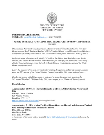 PUBLIC SCHEDULE FOR MAYOR ERIC ADAMS FOR THURSDAY, SEPTEMBER 22, 2022
