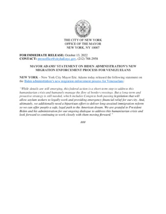 MAYOR ADAMS’ STATEMENT ON BIDEN ADMINISTRATION’S NEW MIGRATION ENFORCEMENT PROCESS FOR VENEZUELANS