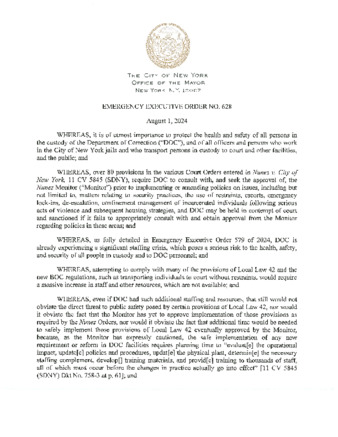 Emergency Executive Order No. 628 is being submitted to extend EEO 625, dated July 27, 2024; for five (5) days as it relates to the provisions of Local Law 42.