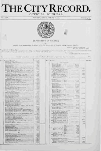 The City Record newspaper publishes notices which includes but is not limited to: public hearings and meetings, public auctions and sales, solicitations and awards and official rules proposed and adopted by city agencies. This is the City Record Newspaper for January 18, 1901.