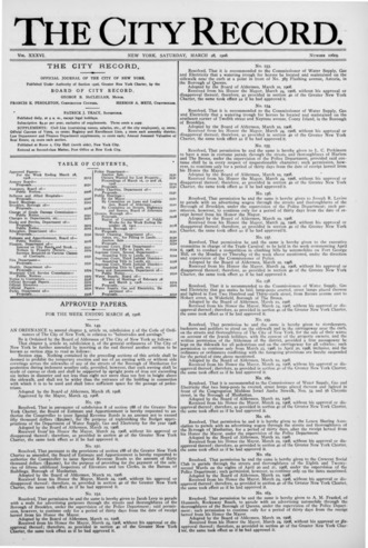 The City Record newspaper publishes notices which includes but is not limited to: public hearings and meetings, public auctions and sales, solicitations and awards and official rules proposed and adopted by city agencies. This is the City Record Newspaper for March 28, 1908.