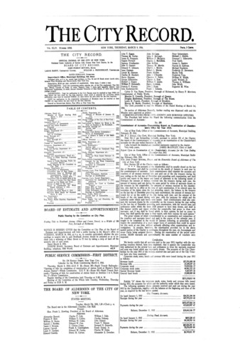 The City Record newspaper publishes notices which includes but is not limited to: public hearings and meetings, public auctions and sales, solicitations and awards and official rules proposed and adopted by city agencies. This is the City Record Newspaper for March 09, 1916.