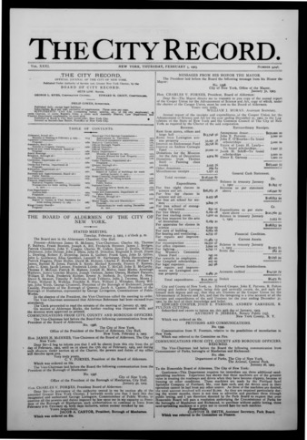 The City Record newspaper publishes notices which includes but is not limited to: public hearings and meetings, public auctions and sales, solicitations and awards and official rules proposed and adopted by city agencies. This is the City Record Newspaper for February 05, 1903.