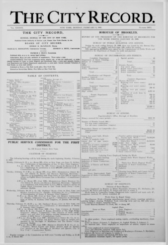 The City Record newspaper publishes notices which includes but is not limited to: public hearings and meetings, public auctions and sales, solicitations and awards and official rules proposed and adopted by city agencies. This is the City Record Newspaper for February 08, 1909.