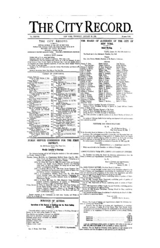 The City Record newspaper publishes notices which includes but is not limited to: public hearings and meetings, public auctions and sales, solicitations and awards and official rules proposed and adopted by city agencies. This is the City Record Newspaper for January 20, 1910.
