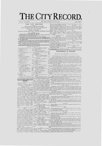 The City Record newspaper publishes notices which includes but is not limited to: public hearings and meetings, public auctions and sales, solicitations and awards and official rules proposed and adopted by city agencies. This is the City Record Newspaper for August 23, 1913.