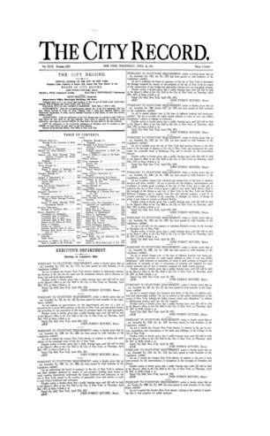 The City Record newspaper publishes notices which includes but is not limited to: public hearings and meetings, public auctions and sales, solicitations and awards and official rules proposed and adopted by city agencies. This is the City Record Newspaper for April 28, 1915.