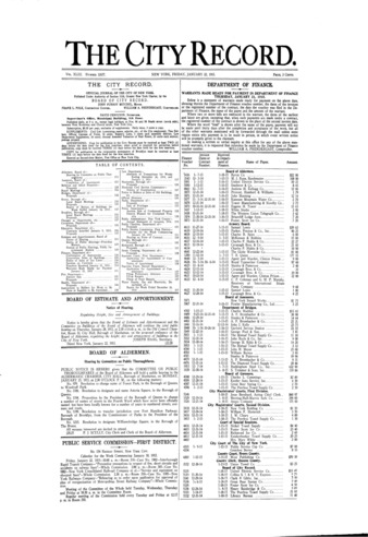 The City Record newspaper publishes notices which includes but is not limited to: public hearings and meetings, public auctions and sales, solicitations and awards and official rules proposed and adopted by city agencies. This is the City Record Newspaper for January 22, 1915.